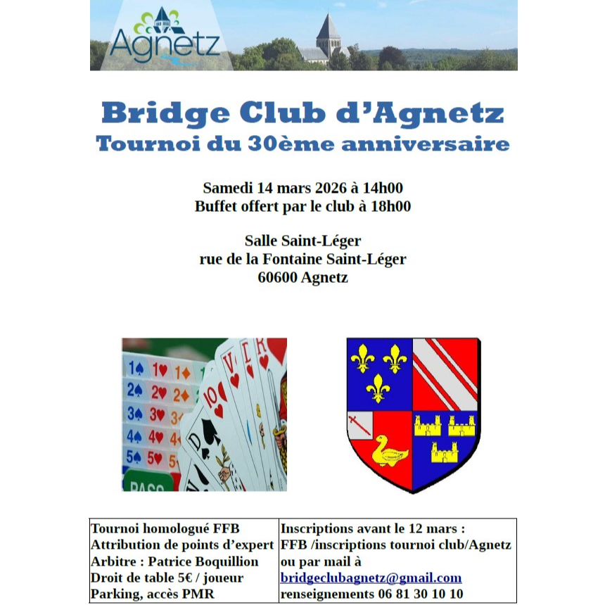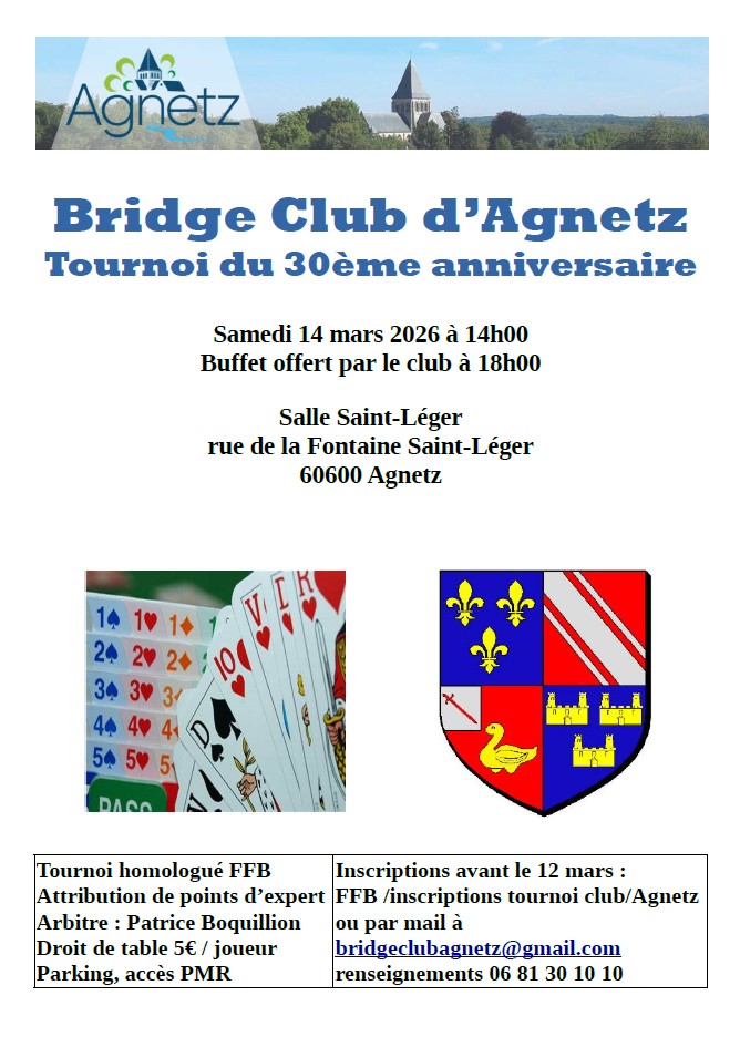Le Bridge club d'Agnetz organise un tournoi ouvert à tous, pour fêter son 30ᵉ anniversaire, le 14 mars prochain dans la salle Saint-Léger.